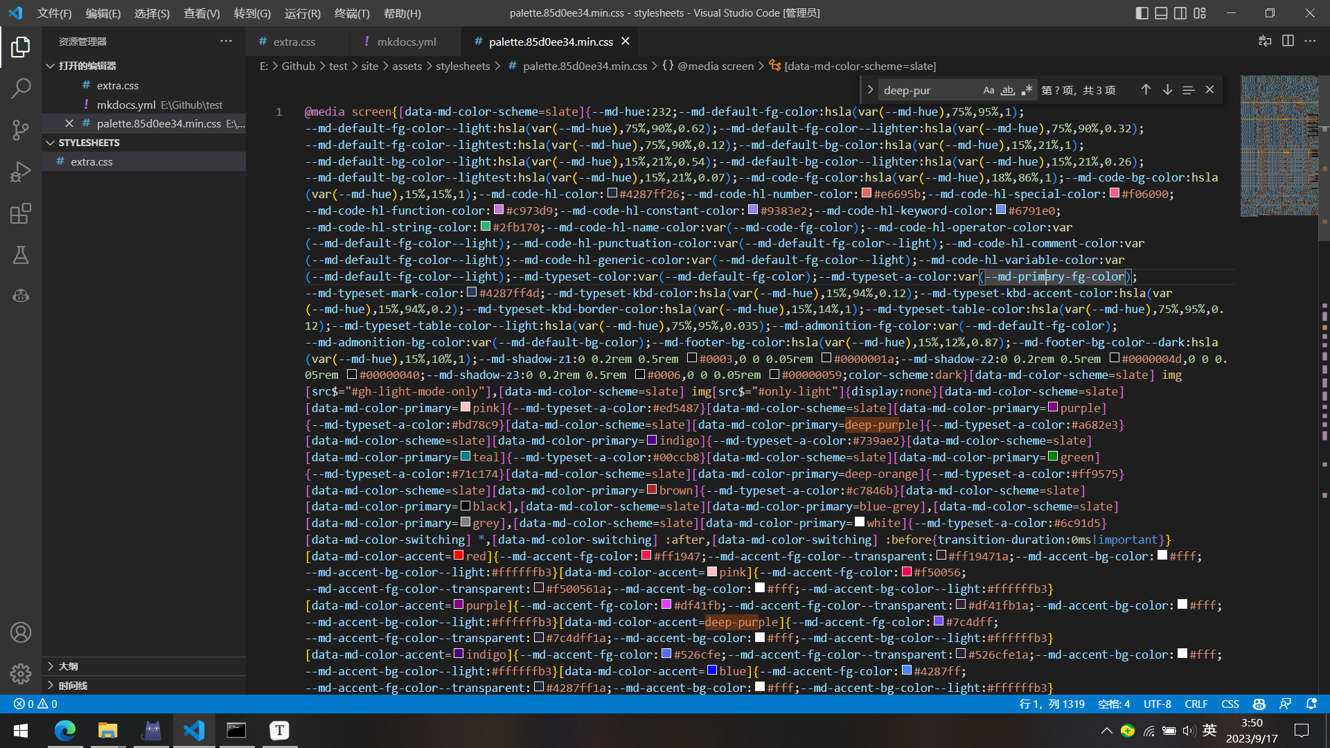 经过尝试后,在 site/assets/stylesheets 目录下找到 palette.xxxxxxxx.min.css 文件,