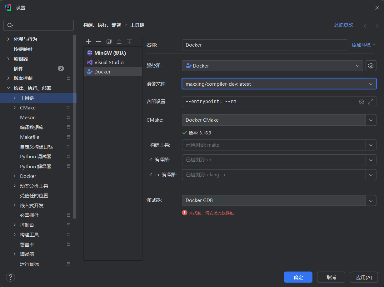 然后我按照那上面的说明,先在工具链中添加要使用的docker镜像,但是发现课程官方提供的镜像中没有安装gdb(应该是clion调试需要用到gdb)