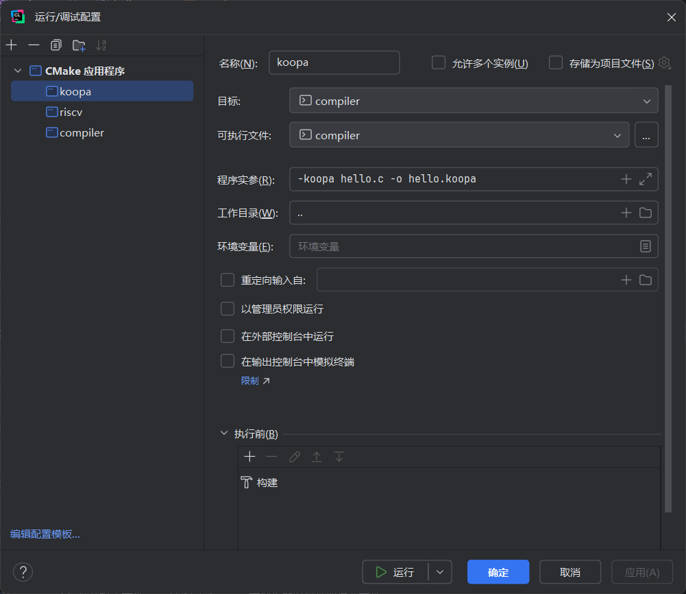 最后因为课程中的编译器使用时需要输入命令行参数,所以需要编辑运行/调试配置
