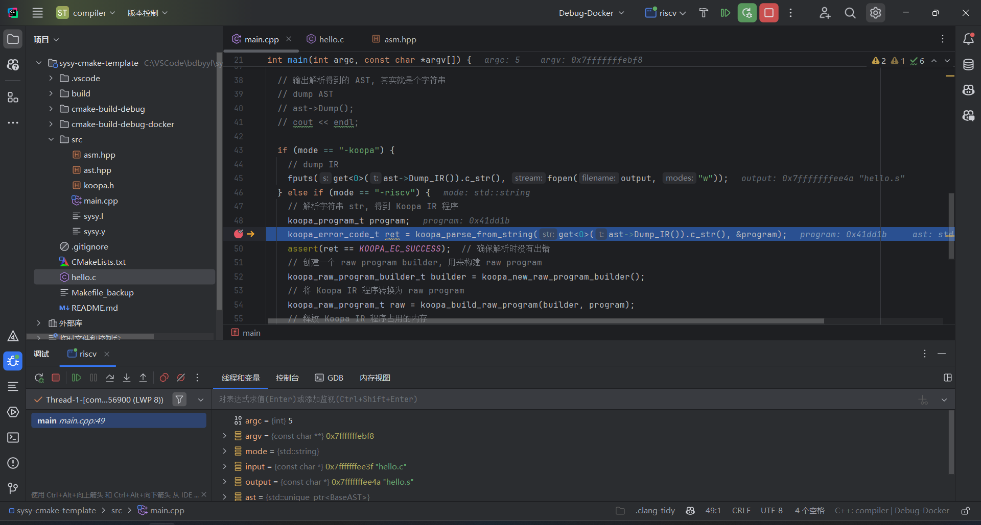 在完成北大编译实践课程的过程中,由于实验环境是用的docker,我在vscode上不能直接进行断点调试(直接调试使用的是我电脑上的环境)。之前也尝试过使用vscode来连接docker容器,但是要调试似乎需要添加tasks.json和launch.json,比较复杂,并且也没弄成功。
